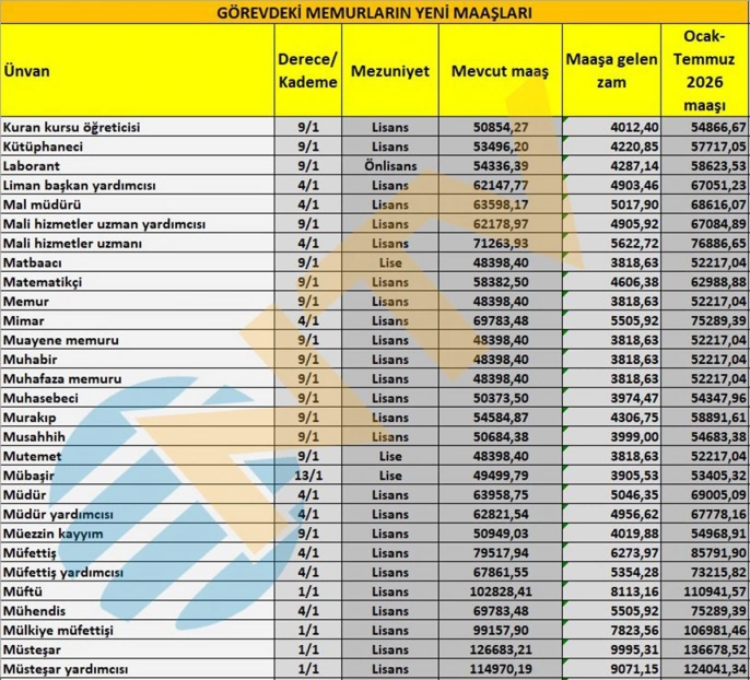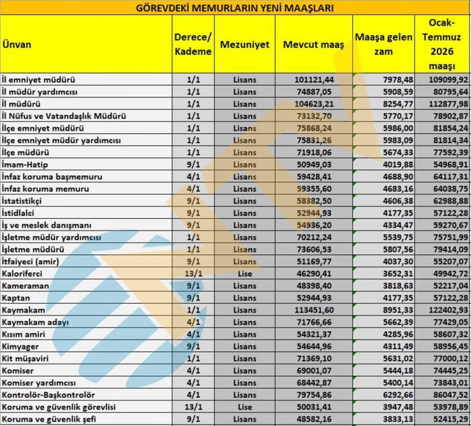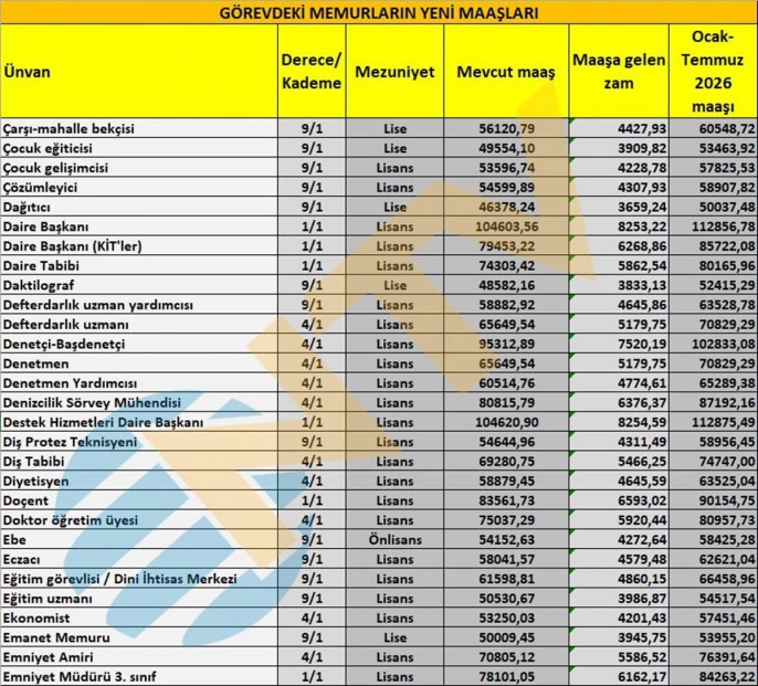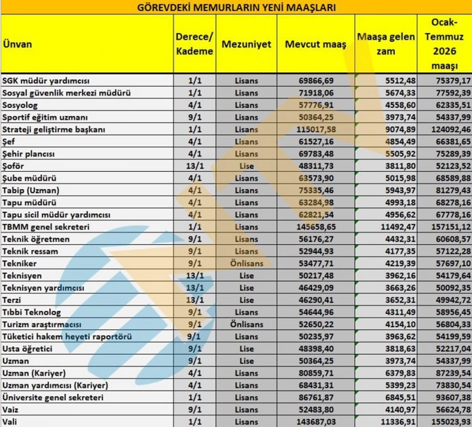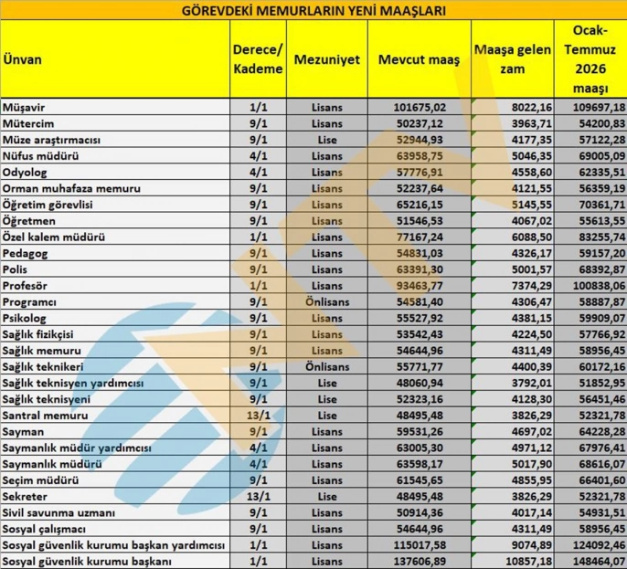 Temmuz ayı enflasyonu ve Ocak-Temmuz 2026 dönemi verileri dikkate alındığında, resmi olmayan zam oranı %11'e göre hesaplandığında memur ve memur emeklisinin zam oranı şu an için %7.89 seviyesinde bulunuyor. Ünvanlara göre detaylı maaş listeleri ise kamuoyuyla paylaşılacak.