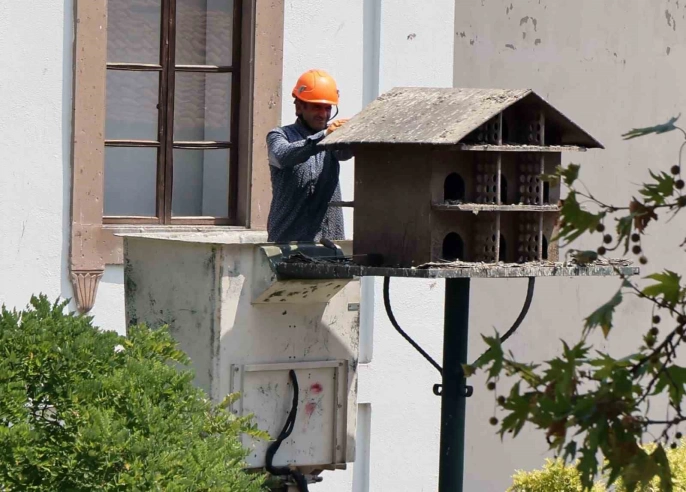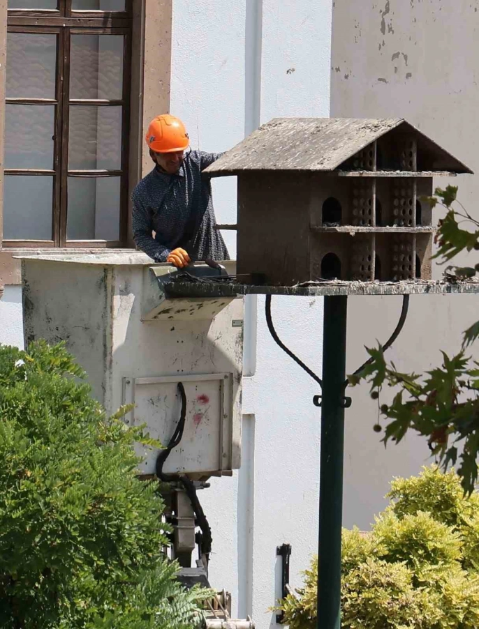 Kurşunlu Meydanı'nda, şehre görsel güzellik katan güvercinler için özel olarak yapılan yuvalar, belediye ekipleri tarafından temizleniyor. Sepetli vinç kullanılarak yuvalara ulaşan ekipler, biriken atıkları temizleyerek güvercinler ve yavruları için hijyenik bir ortam oluşturuyor.