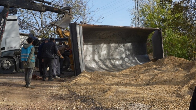 Mıcır yüklü kamyonun damperi devrildi, sürücü bayıldı