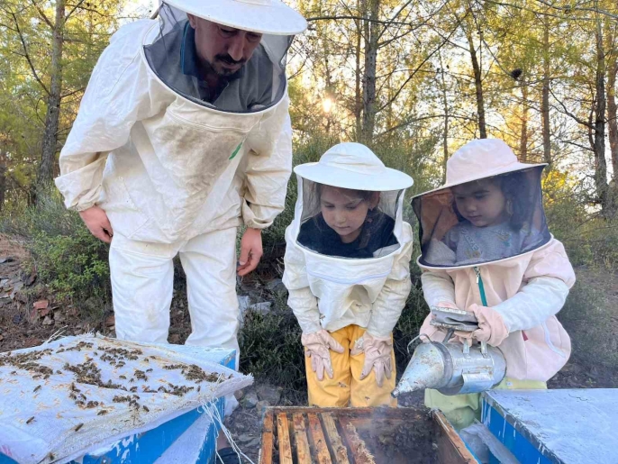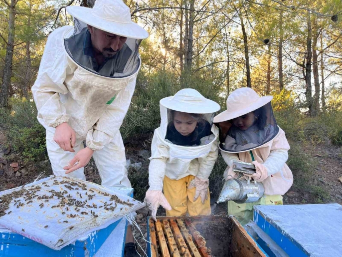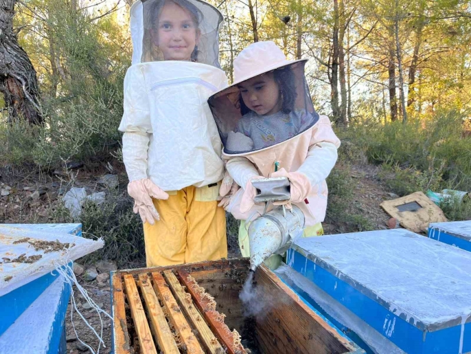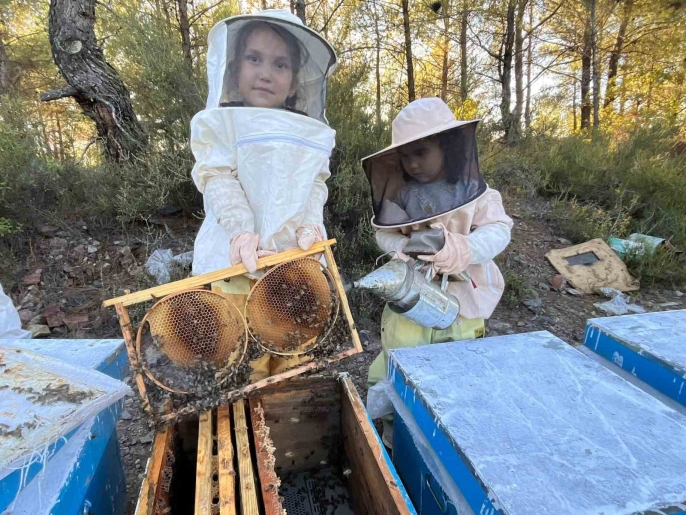 Muğla'nın Yatağan ilçesinde, Servet Çıldır isimli arıcının 6 ve 3 yaşlarındaki kızları, babalarına arıcılık faaliyetlerinde yardımcı olarak dikkat çekiyor.