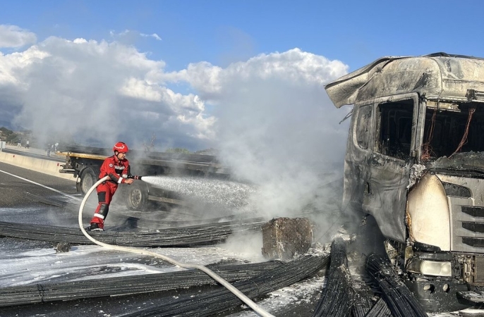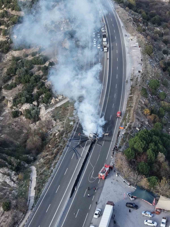 Olay yerine intikal eden itfaiye ekipleri, tırı tamamen saran alevlere anında müdahale ederek yangını kontrol altına almayı başardı. Ancak tüm çabalara rağmen tır, çıkan yangında tamamen kullanılamaz hale geldi. Yangın söndürme çalışmaları esnasında, karayolunun her iki yönünde de kilometrelerce uzunlukta araç kuyrukları oluştu ve ulaşımda aksamalar yaşandı. Kazada şans eseri yaralanan olmazken, olayla ilgili soruşturma jandarma tarafından titizlikle sürdürülüyor.