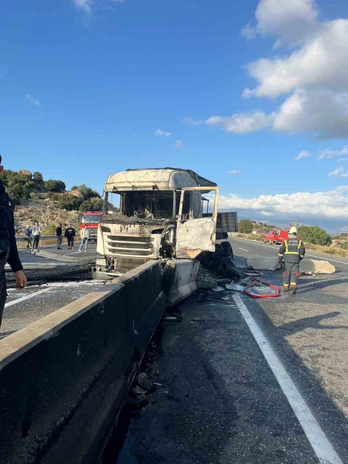 Aydın-Muğla karayolu üzerinde yaşanan trafik kazası, adeta kabusu beraberinde getirdi. Meydana gelen olayda, bir tırın yoldan çıkarak beton bariyerlere çarpması sonucu araç alevler içinde kaldı ve kullanılamaz hale geldi.