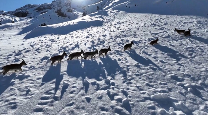 Doğa Koruma Birliği'nin (IUCN) Nesli Tükenme Tehlikesi Altında Olan Türlerin Kırmızı Listesi'nde yer alan yaban keçileri, karla kaplı dağları aşarken etkileyici görüntüler oluşturdu. Yaklaşık 3 bin 300 metre rakımlı zirvelerden zaman zaman bin metre rakımlı kesimlere inen bu hayvanlar, bu sefer 2 bin 800 metre yükseklikte sürüler halinde hareket ederken görüntülendi.