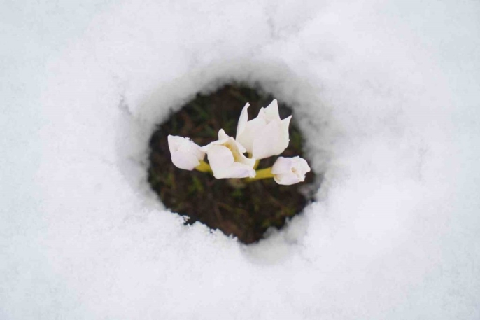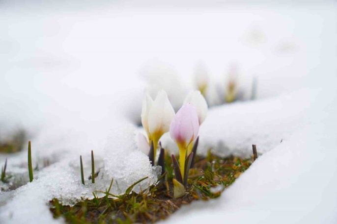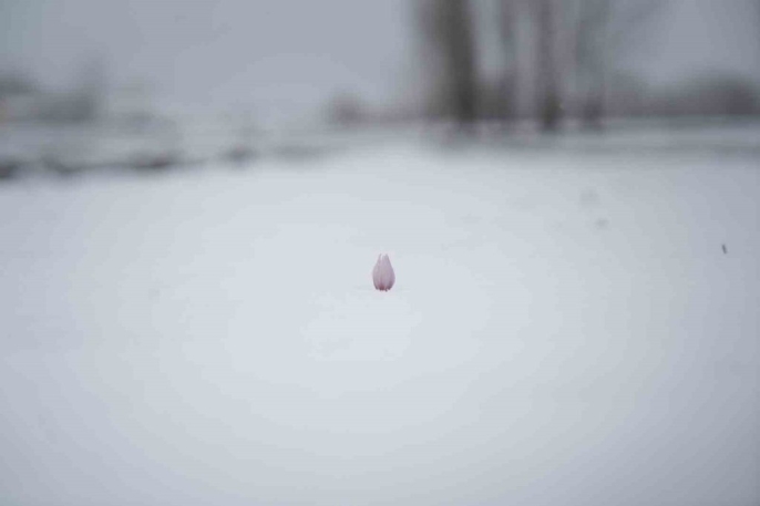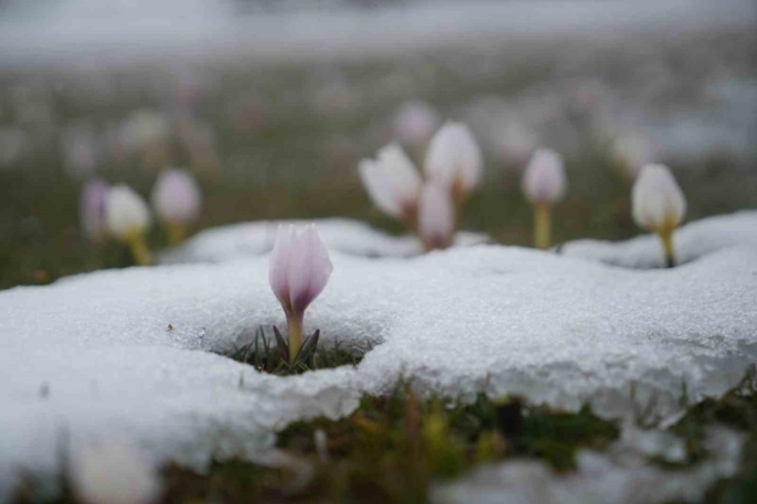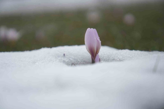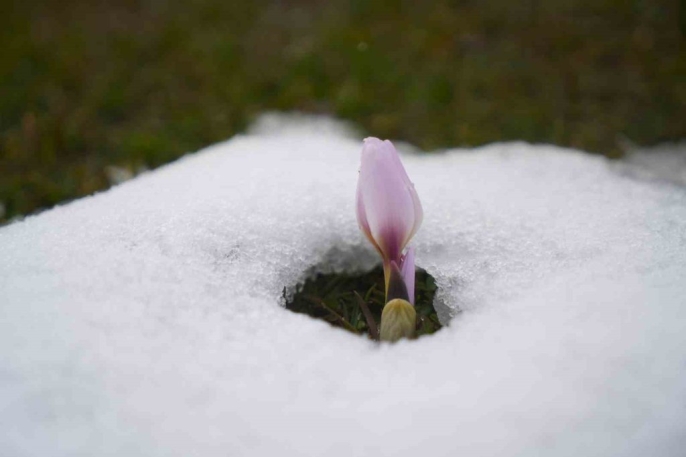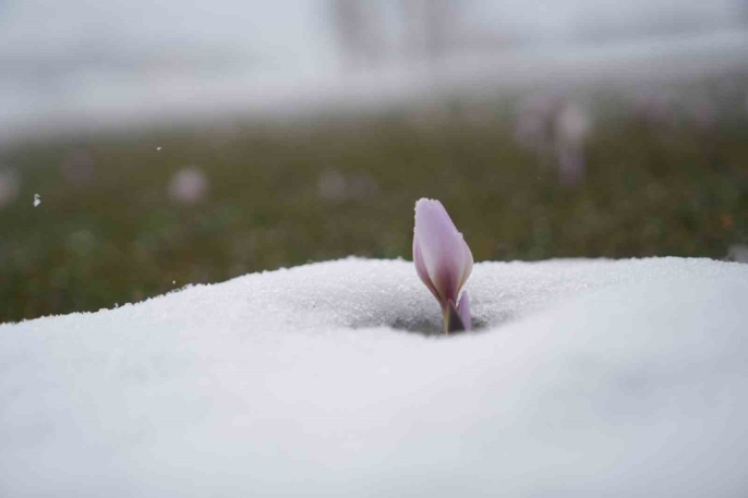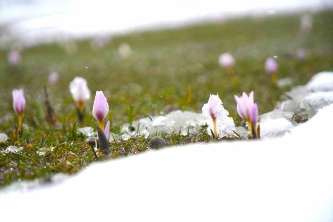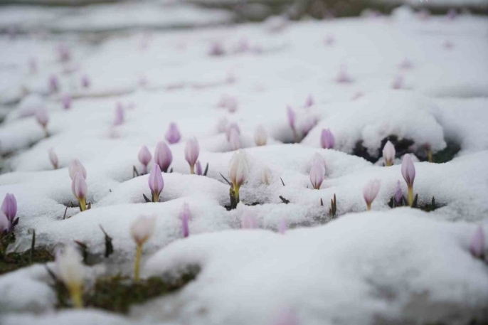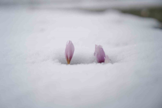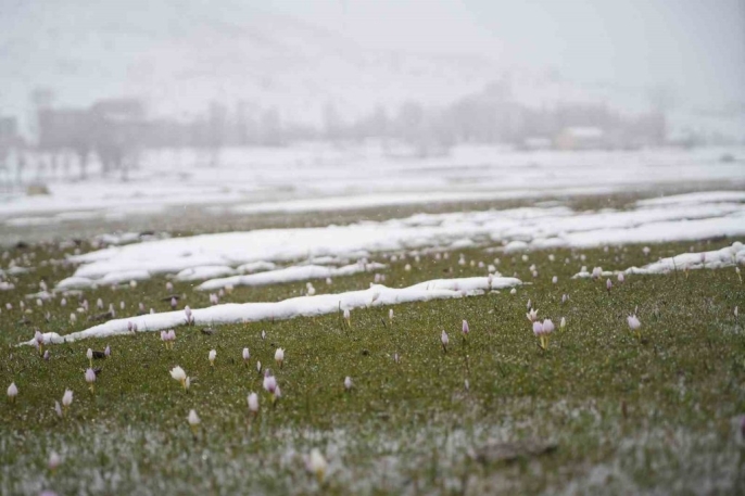 Muş Ovası'nda havaların ısınmasıyla birlikte açmaya başlayan ve "baharın habercisi" olarak bilinen çiğdemler, ani bir kar yağışıyla beyaz örtü altında kaldı. Mor ve sarı tonlarıyla doğayı süsleyen bu narin çiçeklerin karla kaplanması, kış ile baharın bir arada yaşandığı eşsiz manzaralar oluşturdu.