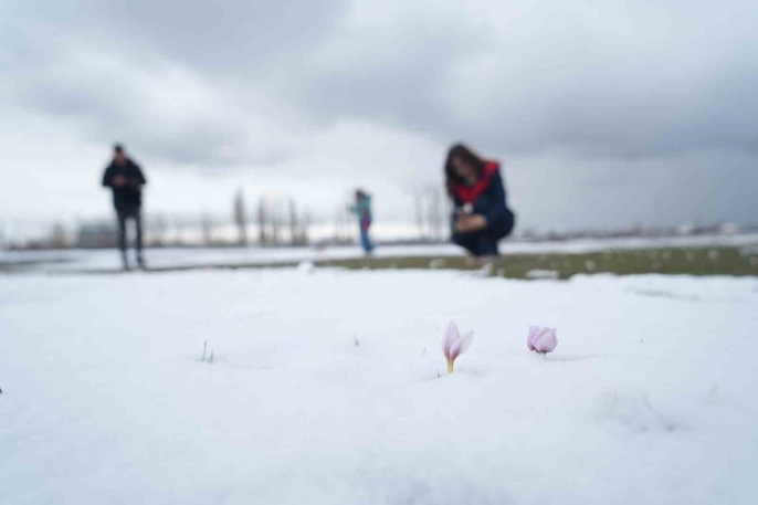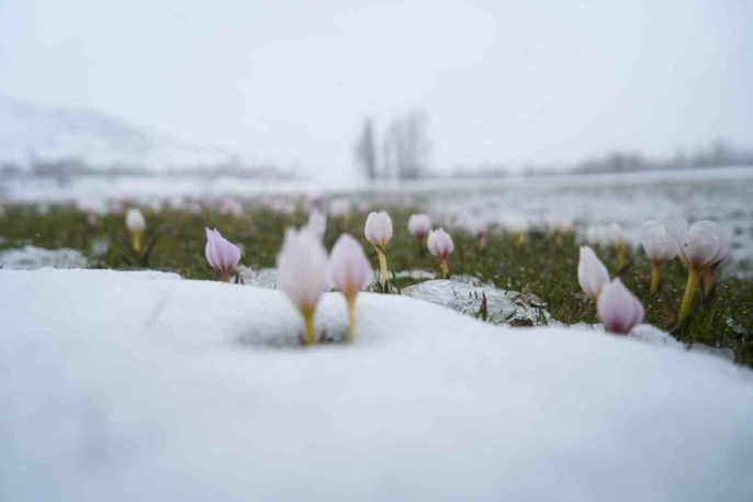Muş Ovası'nda baharın müjdecisi çiğdemler, kar sürpriziyle buluştu