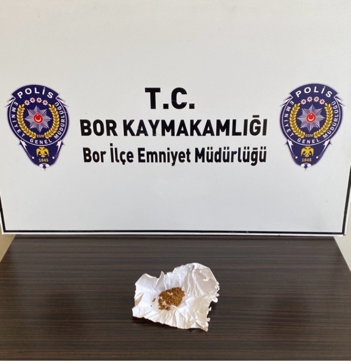 Bor İlçe Emniyet Müdürlüğü Suç Önleme ve Soruşturma Büro Amirliği ekiplerinin yürüttüğü detaylı çalışmalar sonucunda, uyuşturucu veya uyarıcı madde imal ve ticareti yapmak, kullanmak amacıyla satın almak veya bulundurmak suçlarından L.C.G., A.E., A.E. ve M.H.Y. isimli dört şüpheli yakalandı. Yapılan ikamet, araç ve üst aramalarında toplam 138,89 gram uyuşturucu madde, 50 gram tütün, 6 adet sentetik ecza, bir adet uyuşturucu kullanım aparatı, 14 adet 9x19 mm çapında fişek, 2 adet uzun namlulu tüfek fişeği ve 1 adet 45 kalibre fişek ele geçirildi.