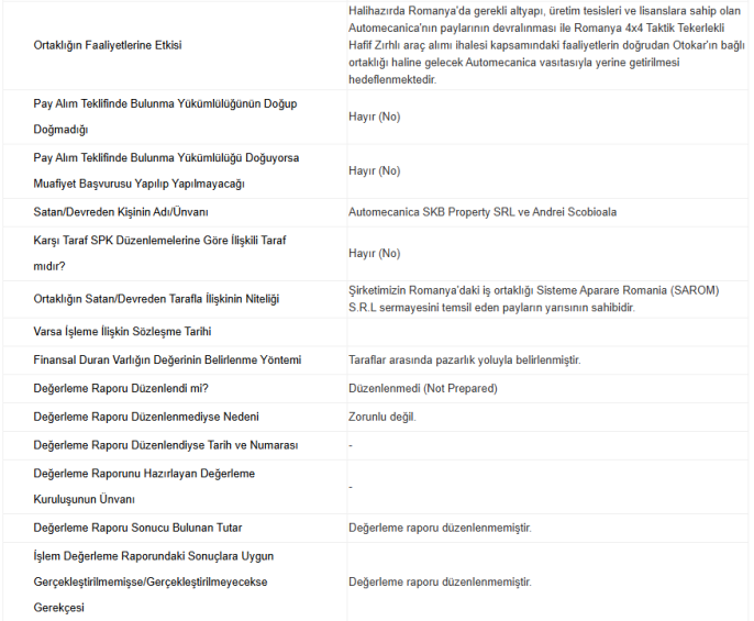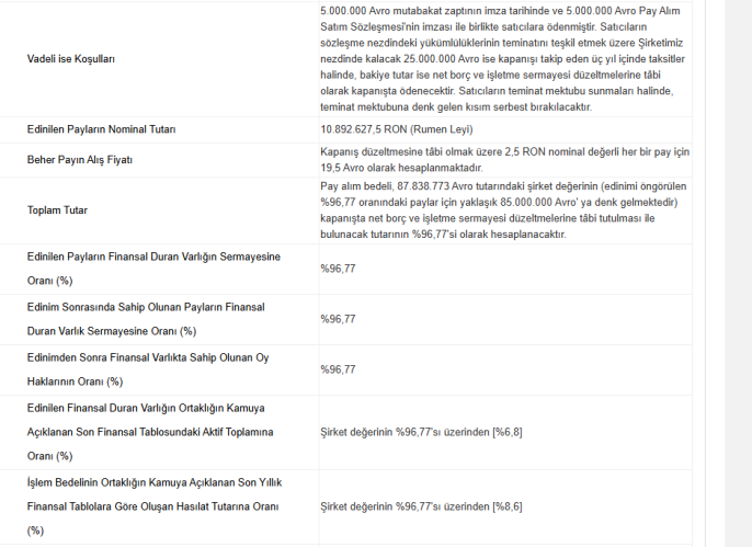 Şirketin pay sahipleri Andrei Scobioala ve Automecanica SKB Property SRL ile yapılan bu sözleşme ile işlemin kapanışı, gerekli yasal izinlerin alınmasının ardından gerçekleşecek. Bu açıklama, Kamuyu Aydınlatma Platformu (KAP) üzerinden kamuoyuyla paylaşıldı.