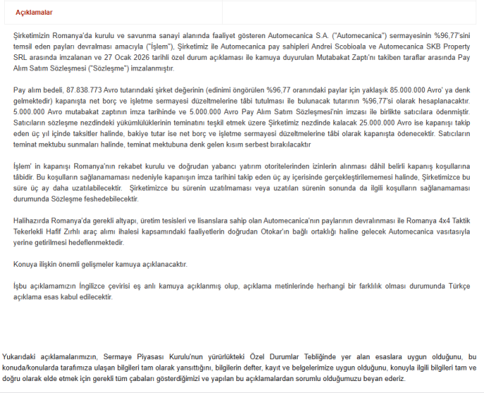 Otokar, Romanya'da savunma sanayi alanında faaliyet gösteren Automecanica'nın yüzde 96,77'sini yaklaşık 85 milyon euroya satın almak üzere önemli bir anlaşma imzaladı.
