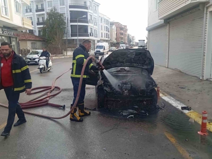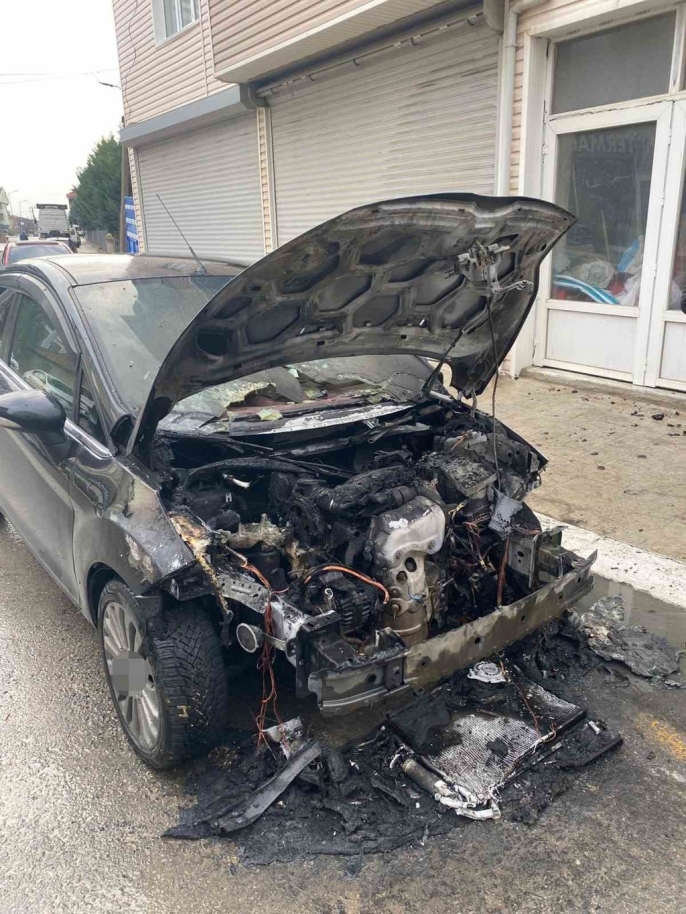 Kırklareli'nin Pınarhisar ilçesinde, park halindeyken motor kısmından alev alan otomobil, itfaiye ekiplerinin zamanında müdahalesiyle söndürüldü.