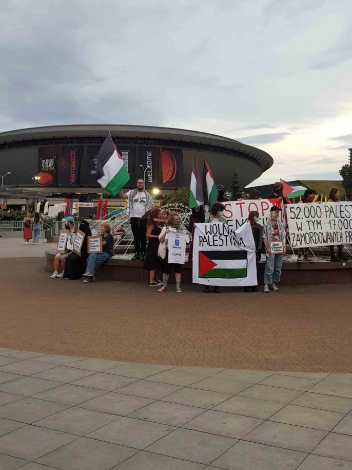 Sadece maç salonunda değil, Spodek Spor Salonu önünde de Polonyalı sağcı ve solcu gruplar tarafından iki ayrı protesto gösterisi düzenlendi. Gösterilerde İsrail'in Gazze'de gerçekleştirdiği katliamın sonlandırılması ve uluslararası toplumun İsrail'i izole etmesi istendi. 'Gerçek terörist İsrail devletidir', 'Filistin’e özgürlük', 'Bir zamanlar Almanlar, şimdi ise Yahudiler. Bütün dünya işledikleri suçları görüyor' yazılı dövizler taşındı ve İsrail karşıtı sloganlar atıldı. Gösteriler olaysız bir şekilde sona erdi. Polonya, basketbol maçını 66-64'lük skorla kazandı.