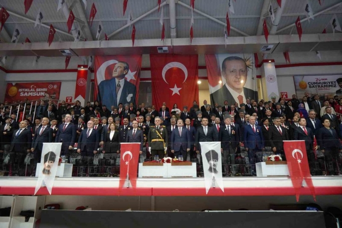 Samsunda Cumhuriyet Bayramı kutlamaları, sabah saatlerinde başlayan sağanak yağmur nedeniyle planlanan Cumhuriyet Meydanı yerine Mustafa Dağıstanlı Spor Salonunda gerçekleştirildi. Törene Samsun Valisi Orhan Tavlı, Garnizon Komutanı Gazi Tümgeneral Davut Ala ve Büyükşehir Belediye Başkanı Halit Doğanın halkın bayramını kutlamasıyla başlandı. Ardından saygı duruşunda bulunulup İstiklal Marşı okundu.