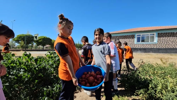 Kayseri'nin Sarıoğlan ilçesine bağlı Merkez Fatih İlkokulu'nda öğrenciler, okul bahçesinde oluşturulan meyve bahçelerinde aktif rol alarak üretim yapıyor.