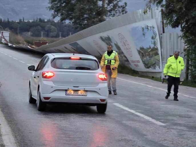 İzmir'in Selçuk ilçesinde etkili olan şiddetli fırtına, Kuşadası yolu üzerinde bulunan büyük reklam panolarını ve demir konstrüksiyonları yola devirdi. Panoların devrildiği sırada yoldan herhangi bir aracın geçmemesi, olası bir faciayı önledi ve olayda can kaybı ya da yaralanma yaşanmadı.