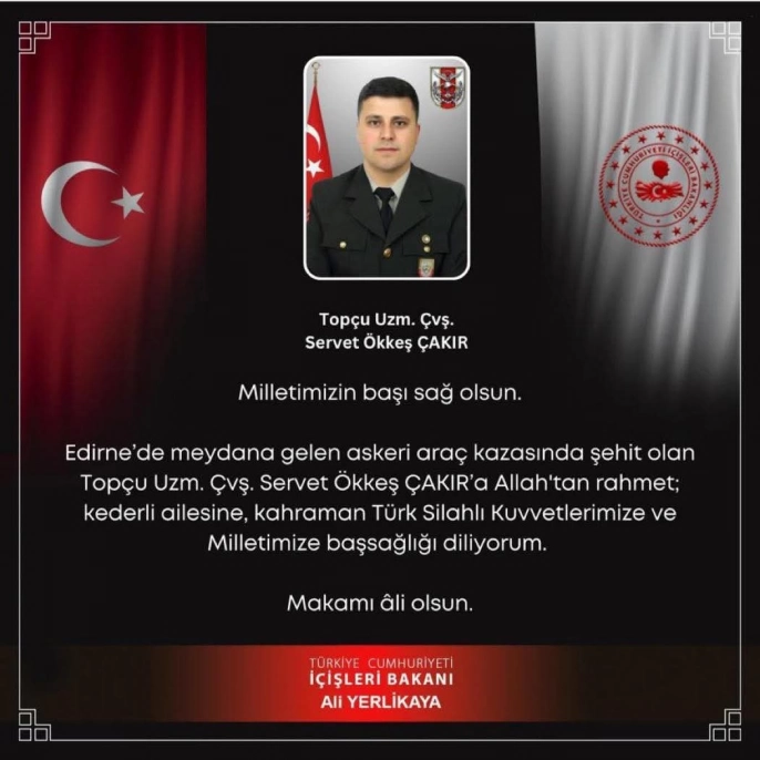 Edirne’nin Uzunköprü ilçesinde görev yapan Topçu Uzman Çavuş Servet Ökkeş Çakır, askeri araç bakımında geçirdiği kaza sonucu şehit oldu. Sabah saatlerinde meydana gelen olayda, Çakır'ın bakımını yaptığı askeri araç, seyir halindeki bir çekici arasında sıkıştı.