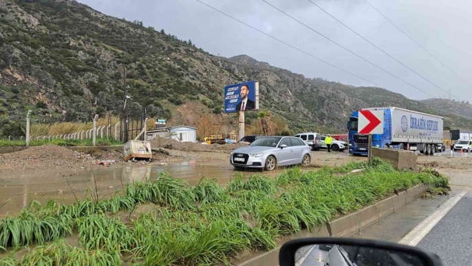 Söke'de sağanak sonrası dağ suları şelaleye dönüştü, karayolu tek şeride düştü