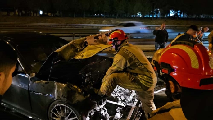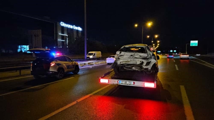 Sultangazi'de TEM Otoyolu Edirne istikametinde saat 03.30 sularında meydana gelen trafik kazasında, aşırı hız yapan bir Maserati marka araç, önündeki Seat marka otomobile arkadan çarptı.
