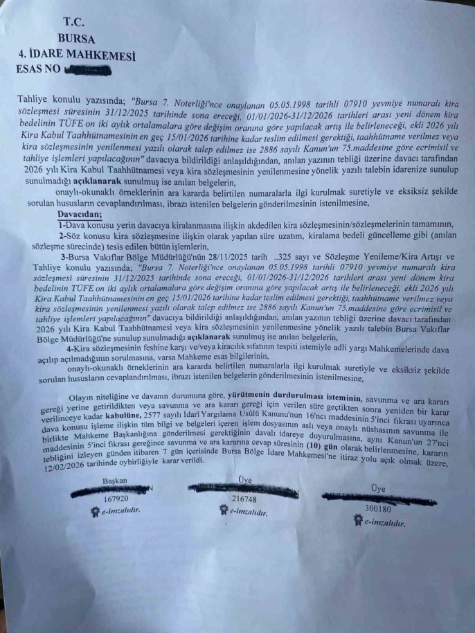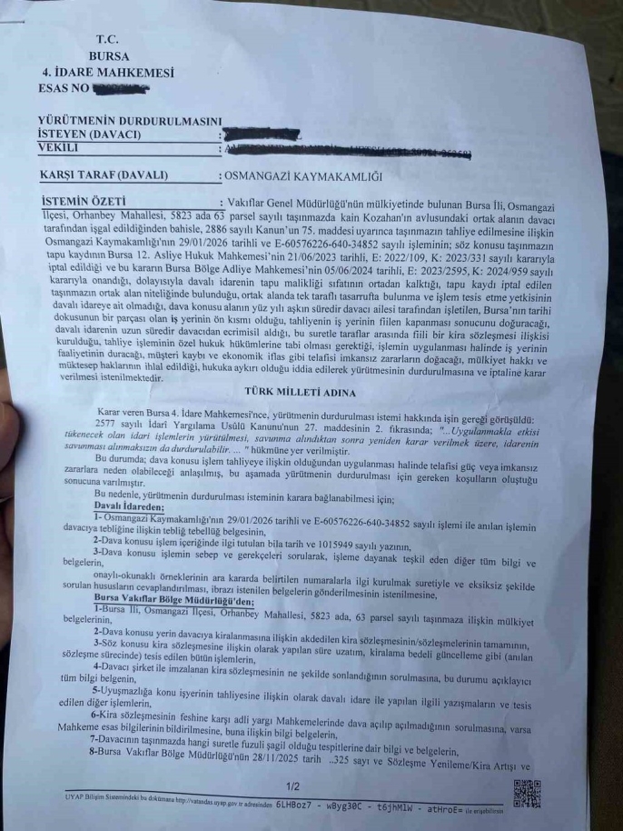 Yaklaşık 25 yıldır Koza Han'da kiracı olan ve 2026 yılına kadar geçerli bir kira sözleşmesi bulunan işletmeci, sözleşmesi varken 'fuzuli şagil' olarak değerlendirilip tahliye edilmesinin hukuka aykırı olduğunu savunmuştu. Mahkeme, işletmenin ticari itibarının ve ekonomik faaliyetlerinin zarar görebileceği endişesiyle, idarenin savunması alınana kadar teminat aranmaksızın yürütmenin durdurulmasına oy birliğiyle karar verdi. Bu karar, han esnafı ve ziyaretçiler için geçici bir rahatlama sağladı.