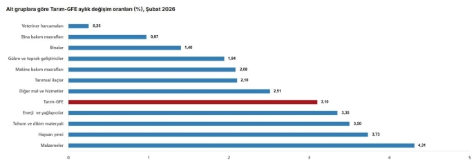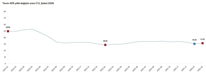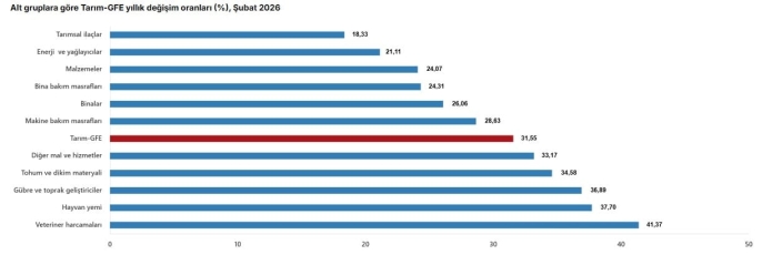 Buna göre, tarımsal girdi fiyatları şubat ayında aylık bazda %3,10, yıllık bazda ise %31,55 oranında artış yaşandı. 2020=100 temel yılına göre hesaplanan Tarım-GFE, 2026 yılı Şubat ayında bir önceki aya göre %3,10, bir önceki yılın Aralık ayına göre %7,08 ve bir önceki yılın aynı ayına göre %31,55 artış kaydetti.