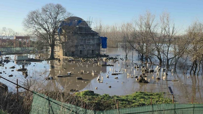 Tunca Nehri taştı, tarihi cami şantiyesi sulara gömüldü