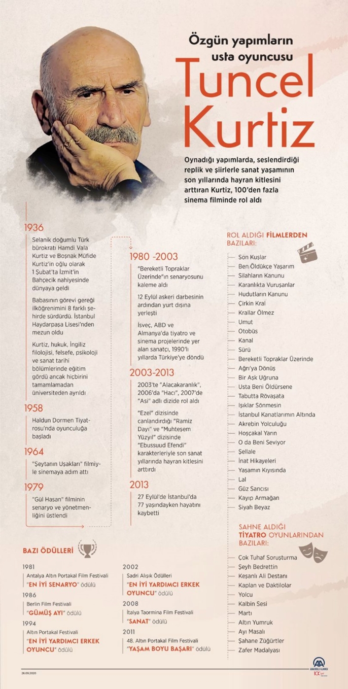 Türk sinema ve tiyatro dünyasının unutulmaz isimlerinden Tuncel Kurtiz, vefatının 12. yıl dönümünde anılıyor. Usta oyuncu, canlandırdığı karakterler ve seslendirdiği anlamlı sözlerle hafızalarda yaşamaya devam ediyor.