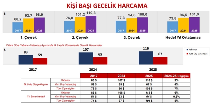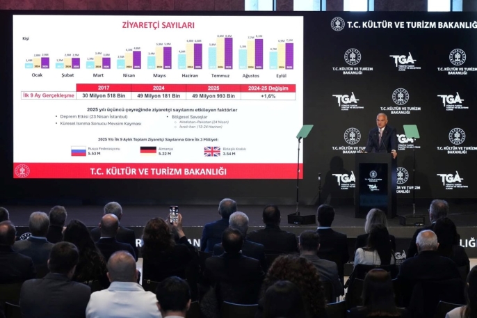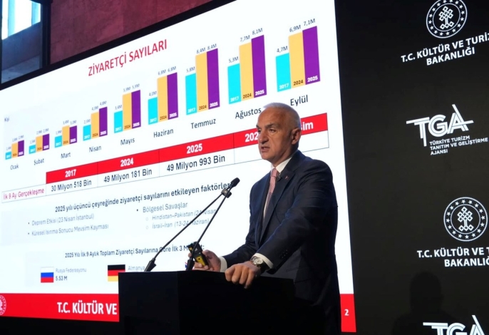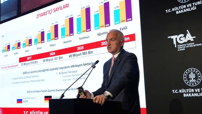 Ersoy, yılın ilk dokuz ayında Türkiyeye gelen ziyaretçi sayısının 49 milyon 993 bine ulaştığını, bu rakamın geçen yıla göre yüzde 1,6lık bir artışa işaret ettiğini belirtti. Ülkelere göre ziyaretçi dağılımında Rusya Federasyonunun 5,53 milyon ziyaretçiyle ilk sırada yer alırken, Almanya ve Birleşik Krallıkın da önemli paya sahip olması, pazar çeşitliliği stratejisinin başarısını gösterdi. Ortalama kalış süresinin 10,3 gün olarak gerçekleşmesi ve kişi başı gecelik harcamanın 116 dolara yükselmesi, Türkiyenin turizm gelirlerini artırma stratejisinin etkinliğini ortaya koydu.
