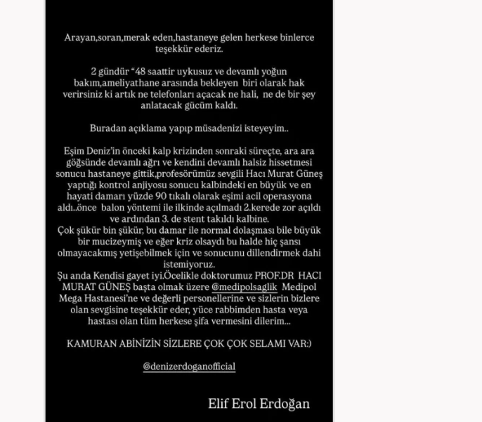 Deniz Erdoğan’ın eşi Elif Erol Erdoğan, sosyal medya hesabından son 48 saatte yaşanan zorlu süreci takipçileriyle paylaştı. Erol Erdoğan, hastaneye gelen ve destek olanlara teşekkür ederek, eşinin durumunun ciddiyetine dikkat çekti. Ayrıca, Deniz’in önceki kalp krizinin ardından sık sık göğüs ağrıları yaşadığını vurguladı. Elif Erol, operasyon sonrası eşinin sağlık durumunun iyiye gittiğini belirterek, destek için gelen tüm dostlarına selam gönderdi.