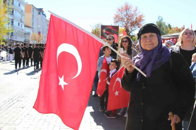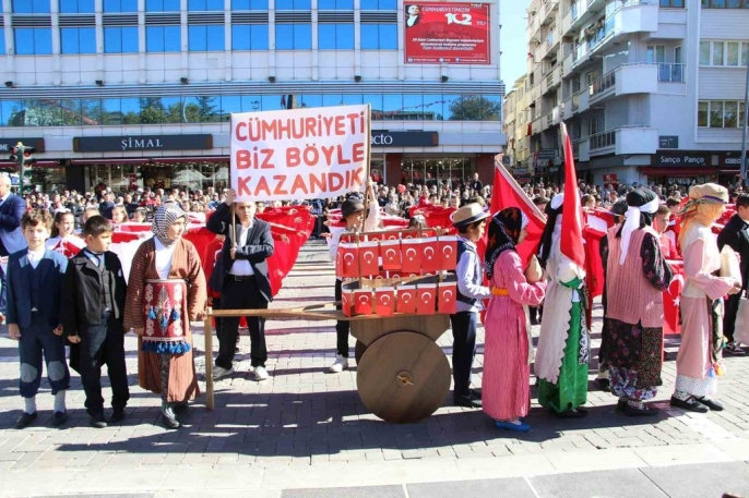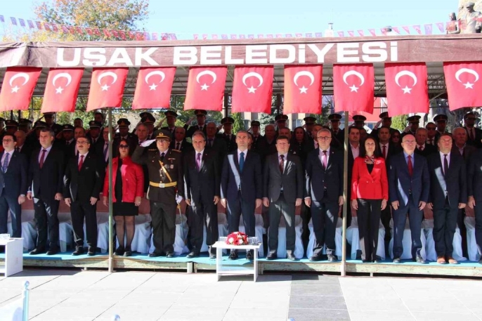 Uşak Valisi Naci Aktaş, konuşmasında milletin 2200 yıllık devlet geleneğine, bağımsızlık aşkına ve 29 Ekim 1923te Cumhuriyetin ilanıyla taçlanan mücadeleye vurgu yaptı. Konuşmanın ardından 102 kişiyle halk oyunları gösterisi yapıldı ve tören resmigeçitle sona erdi.