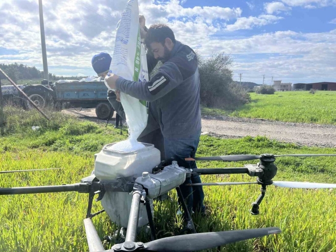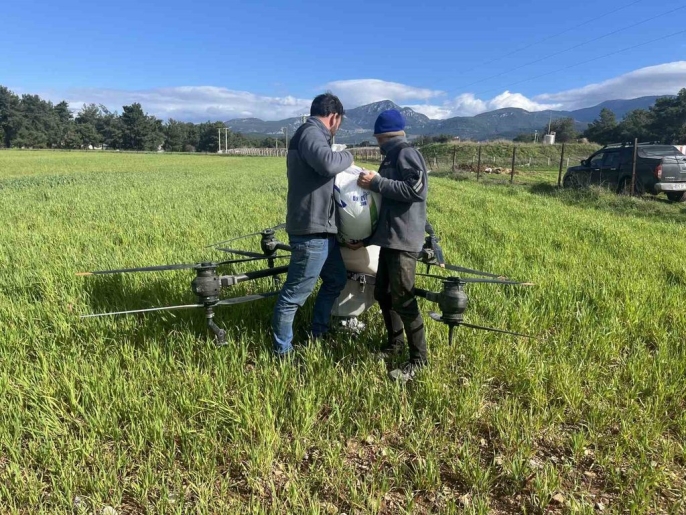 Yağmur sonrası çamura dönen tarlalarda çiftçiler dronla gübreleme yapıyor