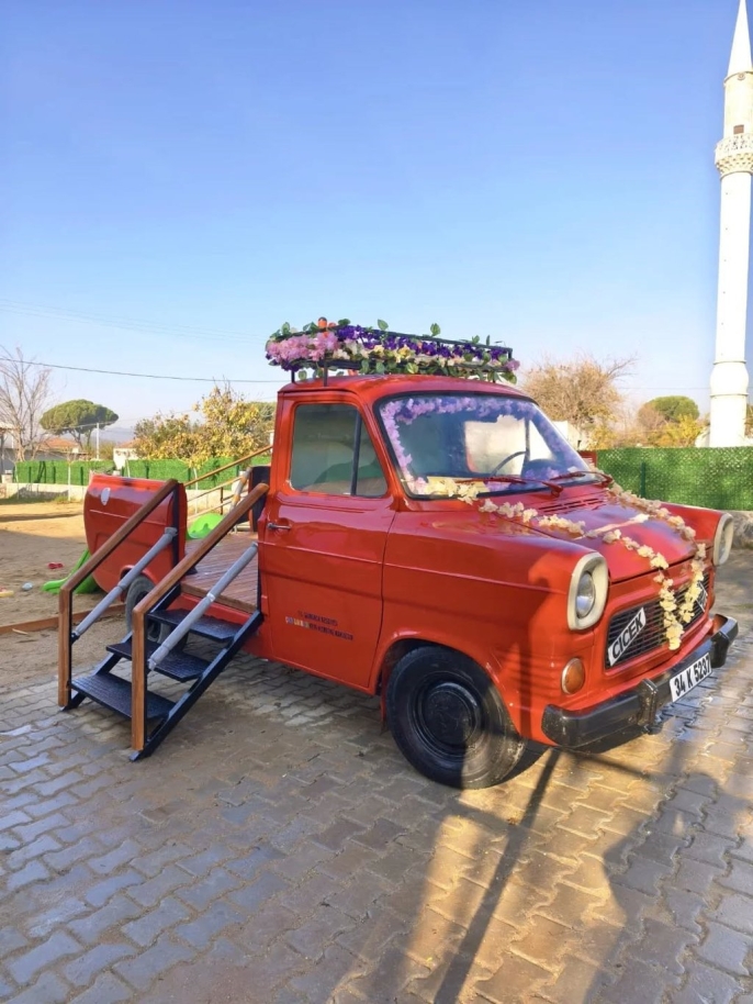 Germencik Belediyesi'ne ait Sini Kahvaltı Evi'nin bahçesine yerleştirilen kırmızı renkli ve çiçeklerle süslenmiş 'Çiçek Abbas' minibüsü, minik ziyaretçiler için güvenli bir oyun alanı olarak tasarlandı. İçine eklenen basamaklar sayesinde çocuklar rahatlıkla içeri girip çıkabiliyor. Bu yenilikçi yaklaşım, vatandaşlar tarafından büyük takdir topladı.
