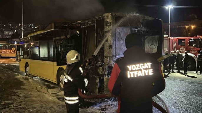 Yozgat'ın şehir merkezinde bulunan otobüs toplanma alanında park halindeki bir özel halk otobüsü, akşam saatlerinde çıkan yangında tamamen kullanılamaz hale geldi.