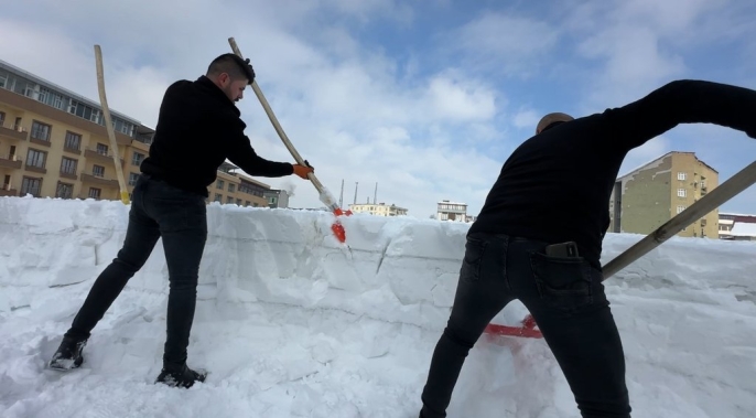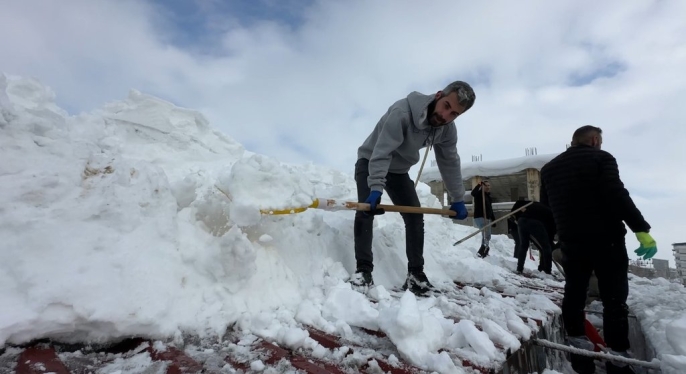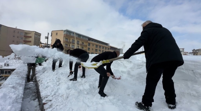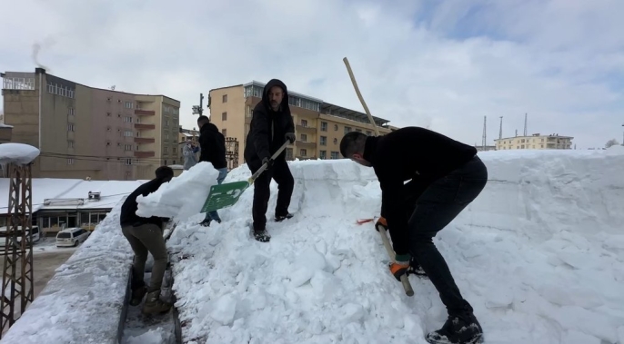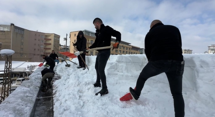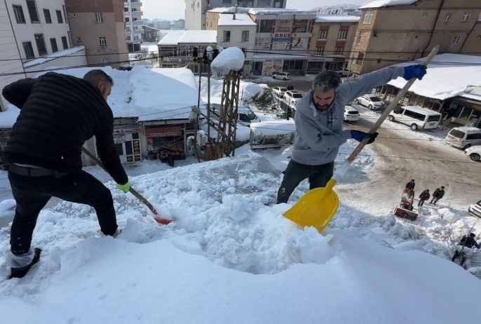 Cumhuriyet Mahallesi'ndeki bir alışveriş merkezinin çatısında biriken karın tehlikeli boyutlara ulaşması üzerine, işletme personeli harekete geçti. Yaklaşık 20 kişiden oluşan ekip, güvenlik önlemlerini alarak binanın çatısına çıktı. Zemini tamamen buz tutan ve yaklaşık 1 metre kalınlığa ulaşan kar kütlelerini küreklerle tahliye eden çalışanlar, zorlu hava koşullarına rağmen yoğun bir mesai harcadı.