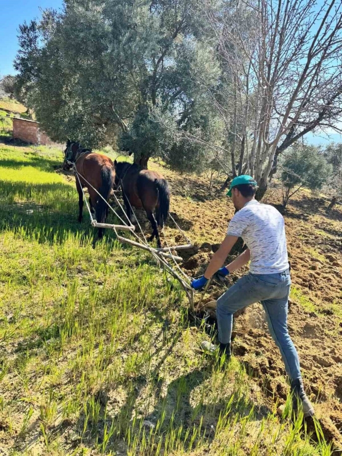 Aydın’ın Efeler ilçesinde, engebeli arazide traktörle çalışma imkanı bulunmayan zeytinlikte, üretici Hidayet Doğan, toprağı atlarla sürerek tarımsal faaliyetlerine devam ediyor.