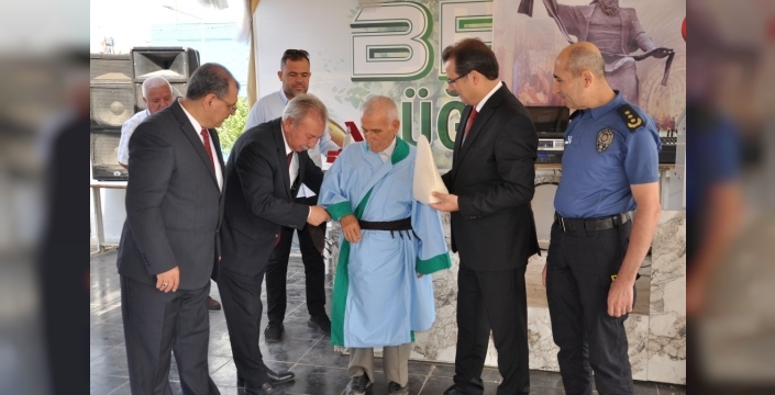 Manisa'nın Salihli ilçesinde Ahilik Haftası kapsamında düzenlenen törende, 45 yıllık bakkal esnafı İbrahim Köksal'a ahi beratı takdim edildi ve şed kuşatıldı.