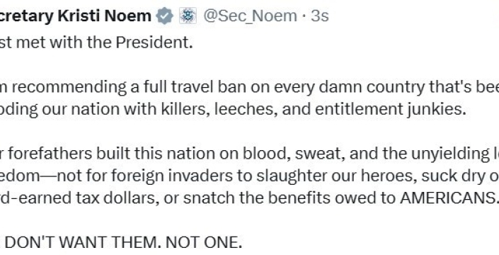 Noem, ABD Başkanı Donald Trump ile bir görüşme gerçekleştirdiğini belirterek, "Ülkemizi katiller, sülükler ve her şeye hakkı olduğunu sanan bağımlılarla dolduran her lanet ülkeye tam seyahat yasağı uygulanmasını öneriyorum" ifadelerini kullandı. ABD'nin kan, ter ve özgürlük sevgisi üzerine kurulduğunu vurgulayan Noem, yabancı işgalcilerin Amerikalı kahramanları öldürmesini, vergileri sömürmesini ve hakları gasp etmesini istemediklerini açıkladı.
