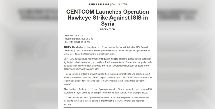 ABD Merkez Kuvvetler Komutanlığı (CENTCOM), Suriye'de DEAŞ unsurlarına yönelik 'Hawkeye Operasyonu' (Şahin Gözü Operasyonu) başlattığını açıkladı. Açıklamada, operasyon kapsamında 70'ten fazla hedefin vurulduğu ve Ürdün Silahlı Kuvvetleri'nin savaş uçaklarıyla destek verdiği belirtildi. Ayrıca, DEAŞ'ın bilinen altyapı ve silah depolarını hedef alan 100'den fazla hassas mühimmat kullanıldığı ifade edildi.