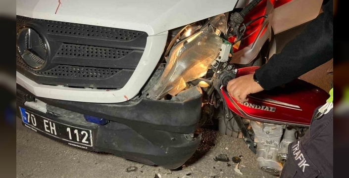 Olay, akşam saat 19.00 sularında İmaret Mahallesi Behçet Kemal Çağlar Caddesi üzerindeki bir kavşakta vuku buldu. Edinilen bilgilere göre, A.T. idaresindeki 70 EH 112 plakalı ambulans, seyir halindeyken kavşakta U.P. yönetimindeki 70 AL 728 plakalı motosiklet ile çarpıştı. Çarpışmanın etkisiyle motosiklet, ambulansın ön tamponu ile tekerleği arasına ok gibi saplanırken, motosiklet sürücüsü yola savrularak yaralandı.