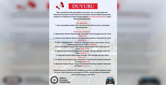 Adana'da trafik güvenliğini artırmak amacıyla yarından itibaren 8 güzergahta 16 noktada EDS ile ortalama hız denetimleri başlıyor. Sürücülerin hız limitlerine uyması hayati önem taşıyor.