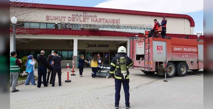 Tatbikat, hastane afet planı çerçevesinde geniş katılımla gerçekleştirildi. Hastanenin arka bölümünde, oksijen tüplerinin bulunduğu alanda meydana gelen patlama, yangın tatbikatının fitilini ateşledi. Yangına ilk müdahale hastane personeli tarafından yapıldı, ancak yangının büyümesi üzerine Şuhut Belediyesi İtfaiyesi olay yerine intikal etti.