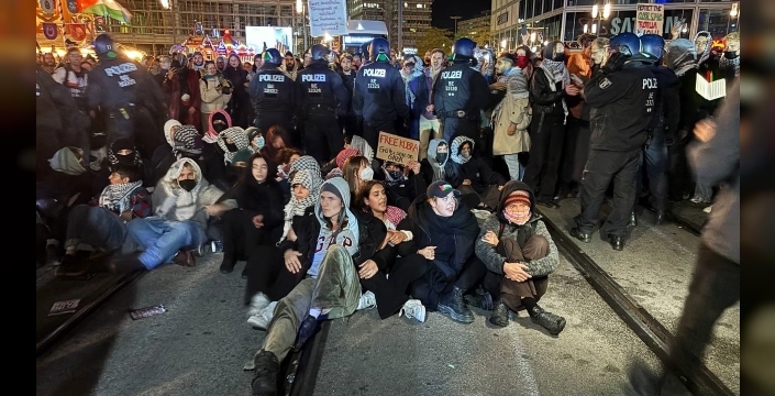 Eylemin sonlarına doğru, Alexander Meydanı'ndan geçen tramvay hattı üzerinde oturma eylemi başlatan bir grup katılımcıya Berlin polisi müdahale etti. Tramvay seferlerinin durmasına neden olan oturma eylemi yapan göstericilere polisin sert müdahalesi, diğer protestocuların tepkisine yol açtı. Polis ile göstericiler arasında karşılıklı fiziki müdahalelerin yaşandığı gerginlikler meydana geldi. Polis, oturma eylemi yapanları tek tek gözaltına alırken, diğer göstericilerin de bölgeden uzaklaştırılması için sert müdahalede bulundu. Gece saatlerine kadar süren olaylarda çok sayıda Filistin destekçisi gözaltına alındı.
