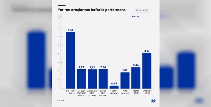 Borsa İstanbul'da işlem gören hisse senetleri, haftalık bazda ortalama yüzde 6,51 değer kazandı. Altının gram fiyatı yüzde 2,23, euro/TL yüzde 1,87 ve dolar/TL yüzde 0,34 artış gösterdi. Bu veriler, yatırım araçlarının son haftadaki performansını ortaya koyuyor.