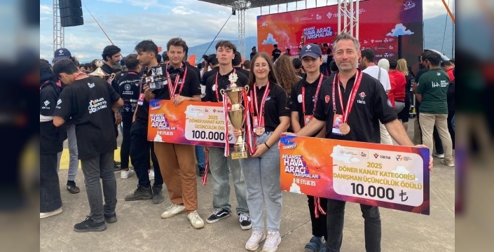 ‘İris’ adlı takım, liseler arası insansız hava araçları yarışmasında 2bin589 başvuru arasından sıyrılarak Türkiye üçüncülüğünü kazandı. Ömer Erdem Sezer, Murat Eymen Altuntaş, Gülden Tunç ve Göktürk Umut Başpınar’dan oluşan takım, danışman öğretmenleri Ferhat Demir önderliğinde bu önemli başarıya imza attı.