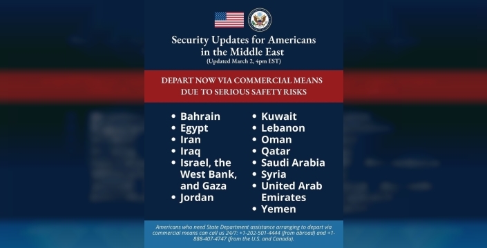 ABD Dışişleri Bakanlığı, Orta Doğu'da artan gerilim ve ciddi güvenlik riskleri nedeniyle 16 ülke ve bölgede bulunan vatandaşlarına acil tahliye çağrısı yaptı. Bakanlık, ABD vatandaşlarının bulundukları yerleri en kısa sürede, ticari yollarla terk etmelerini tavsiye etti.