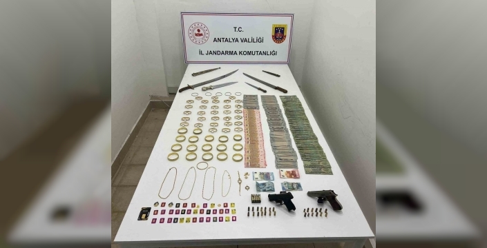 Antalya Kepez'de jandarma, A.Y. ve S.A.'nın adreslerine düzenlediği operasyonda sahte altın, döviz, ruhsatsız silah ve hançer ele geçirdi. Şüpheliler hakkında adli işlem başlatıldı.