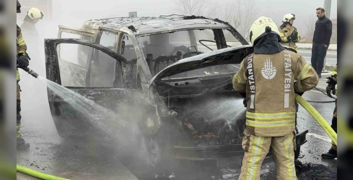 Arnavutköy'de seyir halindeki bir VIP transfer taksi minibüsün bilinmeyen bir nedenle alev alması paniğe neden oldu. Sürücü, son anda aracı yol kenarına çekerek canını kurtarırken, araçtan geriye hurda yığını kaldı.