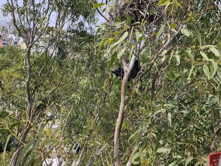 Hatayın Arsuz ilçesinde ayağına ip dolanarak ayakta mahsur kalan karganın yardımını itfaiye ekipleri yetişti.Arsuz ilçesi Karaağaç Şarkonak Mahallesinde ay
