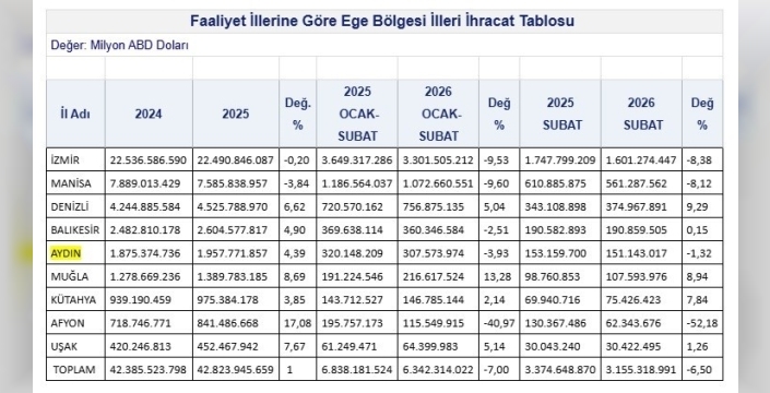 Aydın'ın ihracatı 2026 Şubat ayında bir önceki yıla göre %1,32 azalarak 151 milyon dolara düştü. Yılın ilk iki ayında da düşüş eğilimi sürerken, yıllık bazda artış yaşanması dikkat çekti.