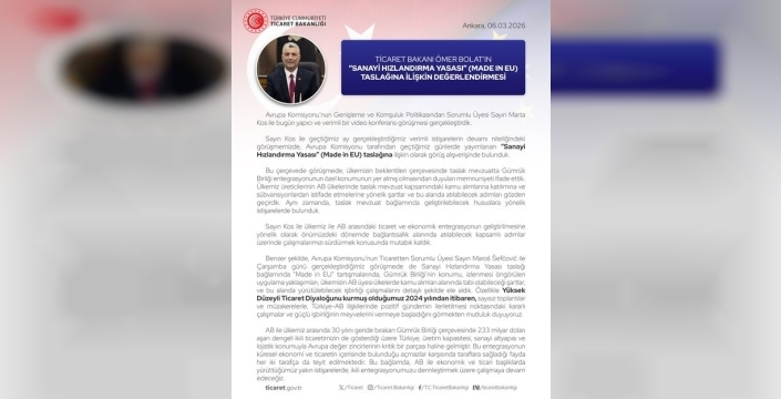 Bakan Bolat, sosyal medya hesabından yaptığı paylaşımda, Kos ile önceki ay yaptıkları verimli istişarelerin devamı niteliğindeki görüşmelerinde, Avrupa Komisyonu tarafından yayımlanan 'Sanayi Hızlandırma Yasası' taslağı hakkında görüş alışverişinde bulunduklarını belirtti. Bu kapsamda, ülkemizin beklentileri doğrultusunda Gümrük Birliği entegrasyonunun özel konumunun taslak mevzuatta yer almasından duyulan memnuniyeti ifade etti. Ayrıca, Türkiye'nin AB ülkelerinde taslak mevzuat kapsamındaki kamu alımlarına katılımı ve sübvansiyonlardan yararlanma şartlarını ele aldıklarını aktardı.