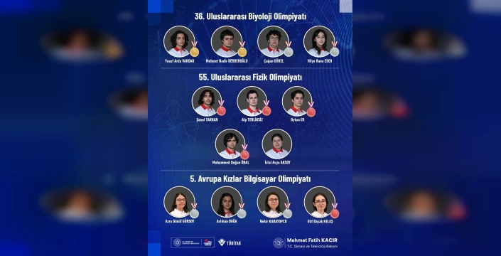 Bakan Kacır, 'Öğrencilerimiz bilim olimpiyatlarında bayrağımızı gururla dalgalandırmaya devam ediyor. Filipinler’de düzenlenen 36’ncı Uluslararası Biyoloji Olimpiyatı’nda 2 altın, 2 gümüş madalya; Fransa’da düzenlenen 55’inci Uluslararası Fizik Olimpiyatı’nda 4 bronz madalya ve 1 mansiyon ödülü; Almanya’da düzenlenen 5’inci Avrupa Kızlar Bilgisayar Olimpiyatı’nda 3 gümüş, 1 bronz madalya kazanan öğrencilerimizi yürekten kutluyorum. Gençlerimizin kararlılığı ve azmi bizim en büyük gücümüz. Onların her daim yanındayız.' ifadelerini kullandı. Madalya kazanan öğrencilerin isimleri de Bakan Kacır tarafından paylaşıldı.