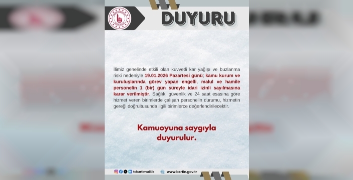 Bartın'da yoğun kar yağışı ve buzlanma nedeniyle, 19 Ocak 2026'da kamu çalışanlarından engelli, malul ve hamire olanlara bir günlük idari izin verildi.