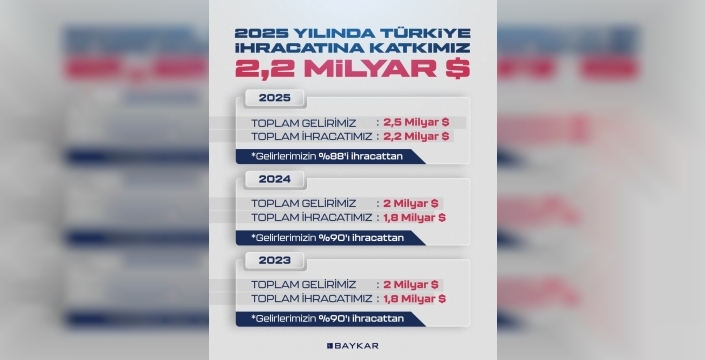 Baykar, 2025 yılında 2.2 milyar dolarlık ihracat rakamıyla dünya SİHA ihracat pazarındaki liderliğini sürdürdü. Ürettiği milli ve özgün SİHA'larla küresel çapta tanınan şirket, geçtiğimiz yıl gelirlerinin yüzde 88'ini ihracattan elde ederek Türkiye'nin yüksek teknoloji ihracatının da lokomotifi oldu.